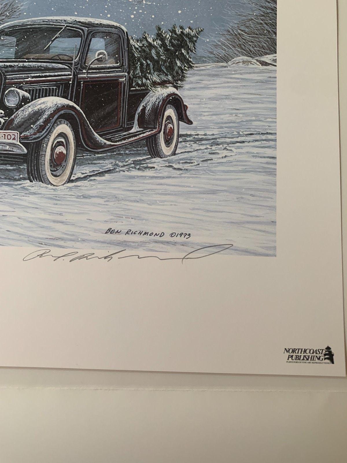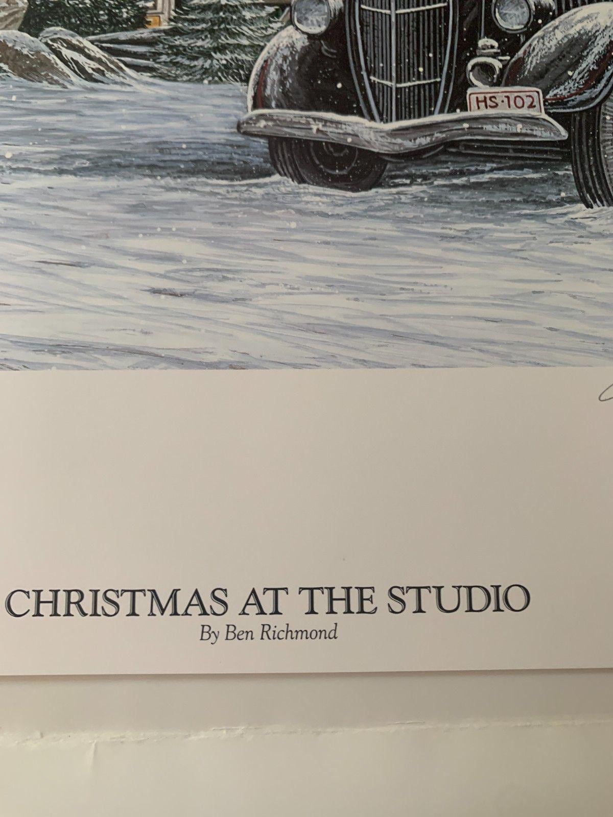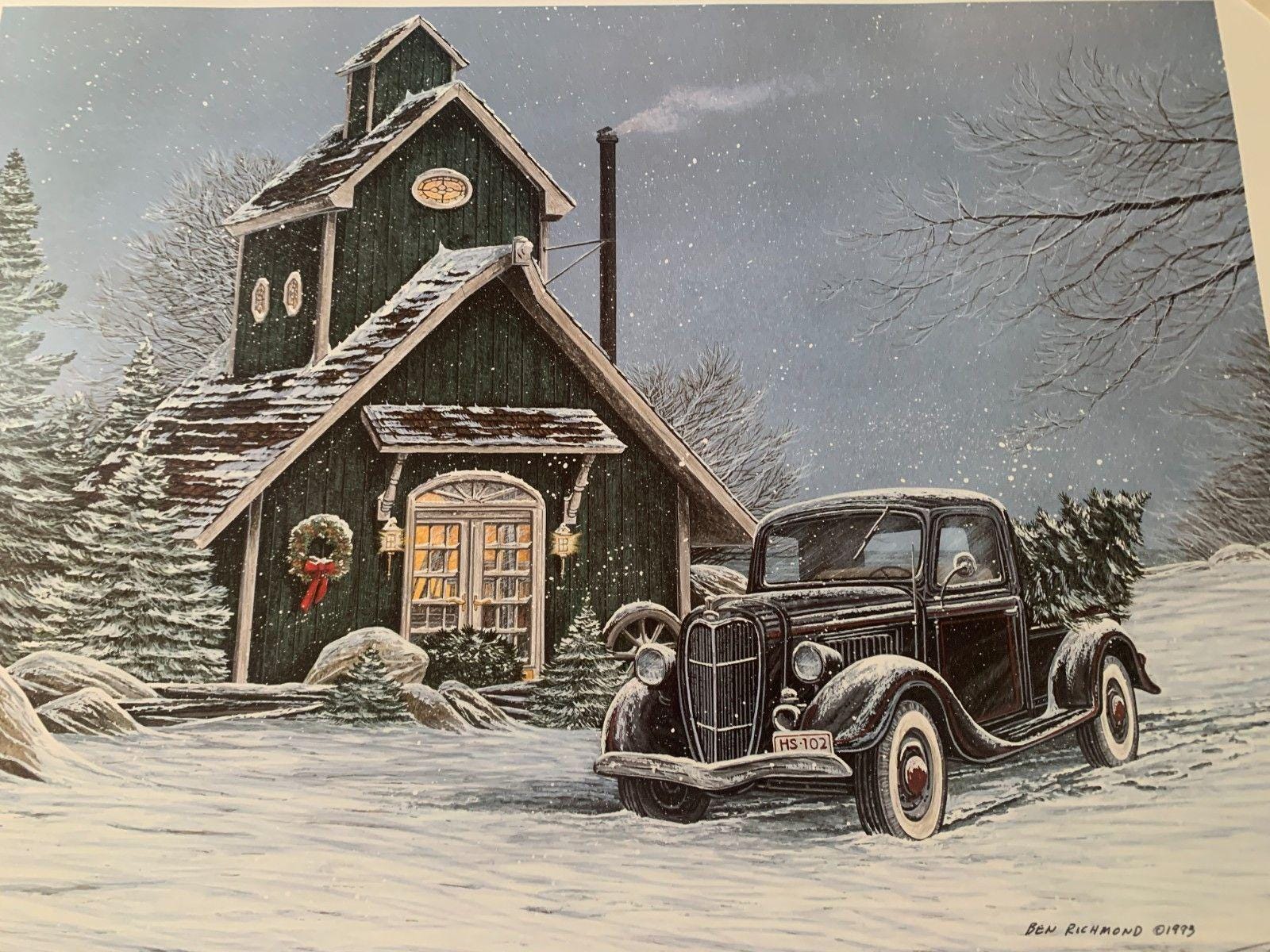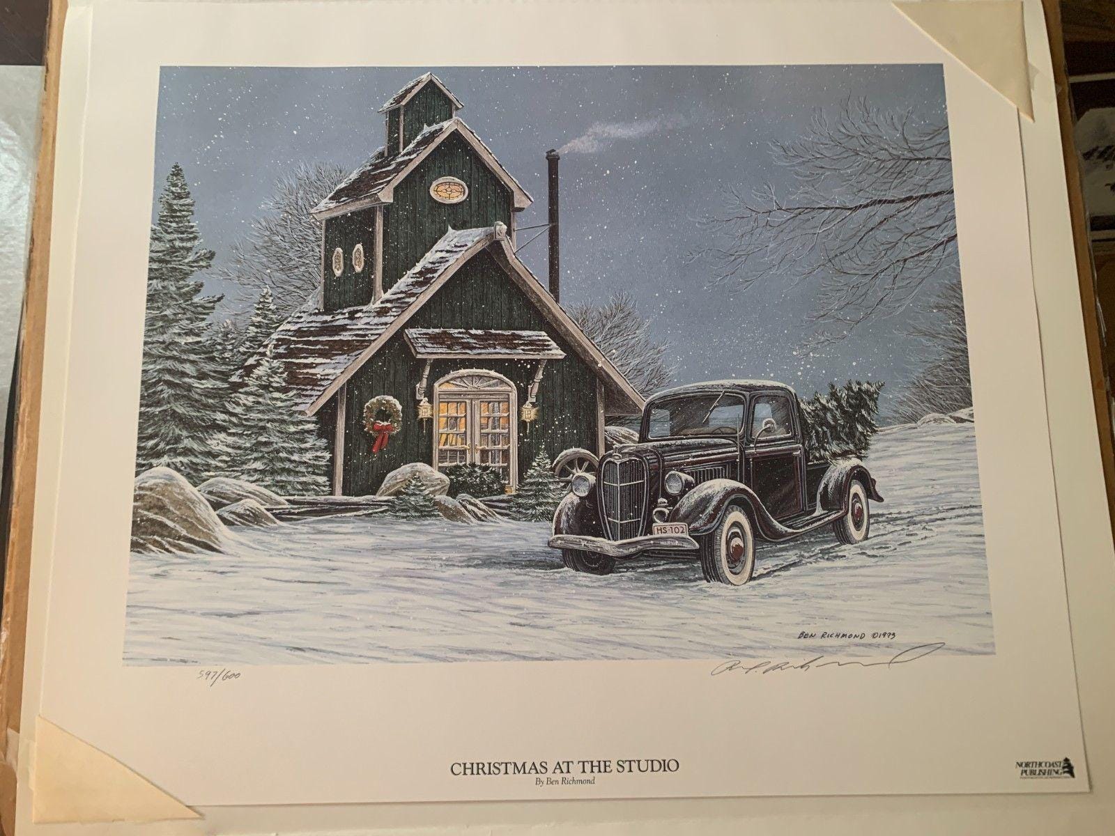 Discover the charm of a snow-covered lakeside studio with a vintage car ready for the holidays with "Christmas at the Studio" by Ben Richmond. This hand-signed lithograph captures the essence of life during the holidays at the artist's studio back in the day!