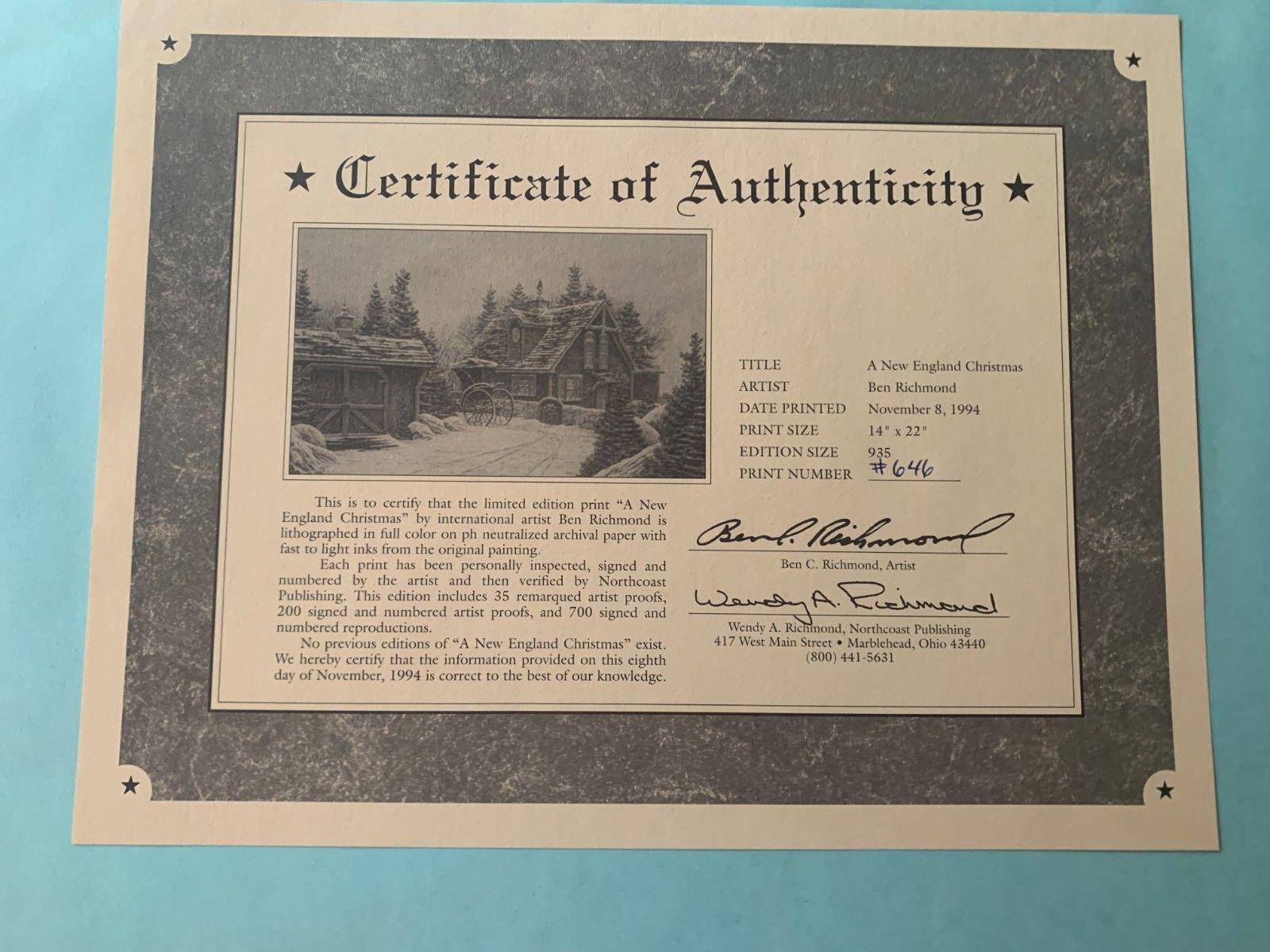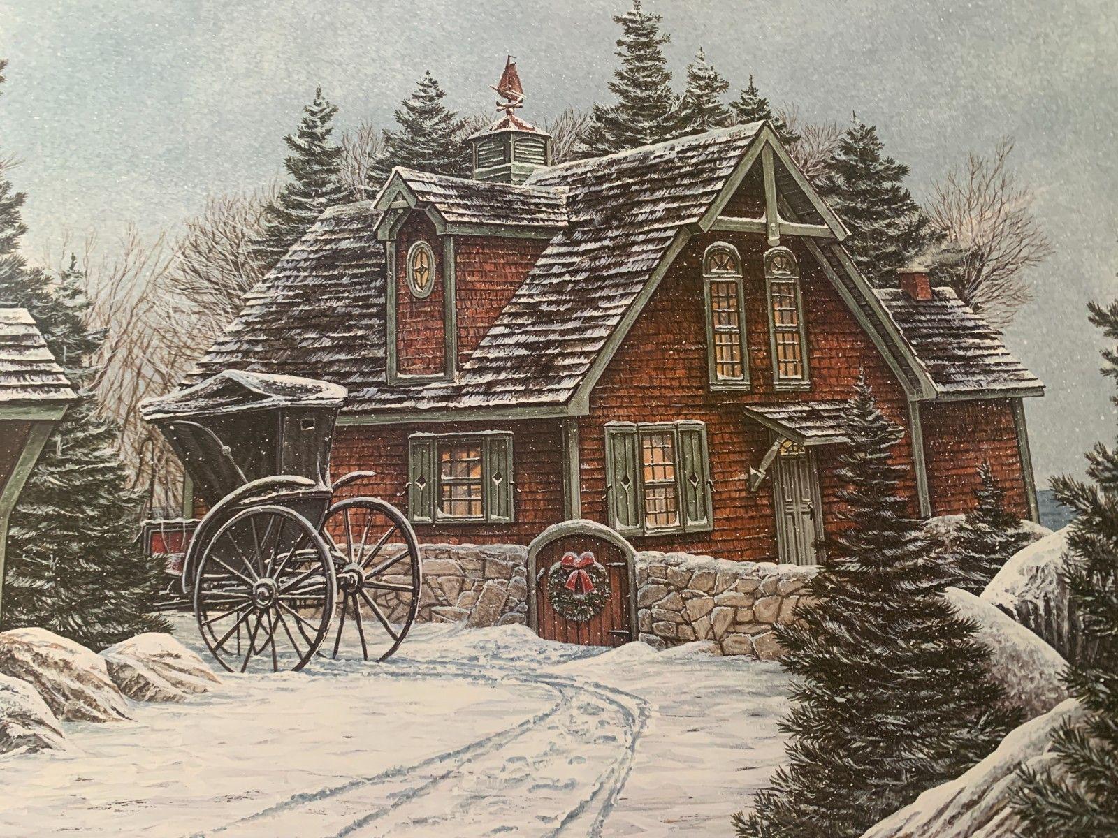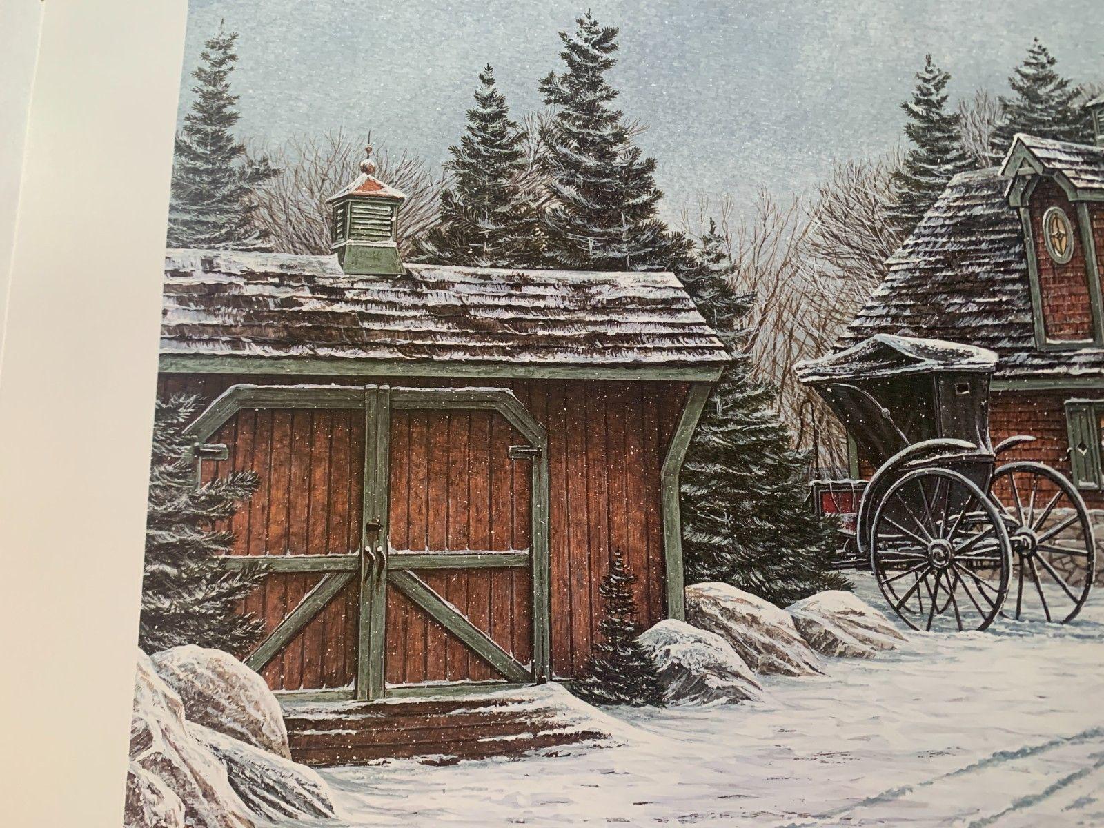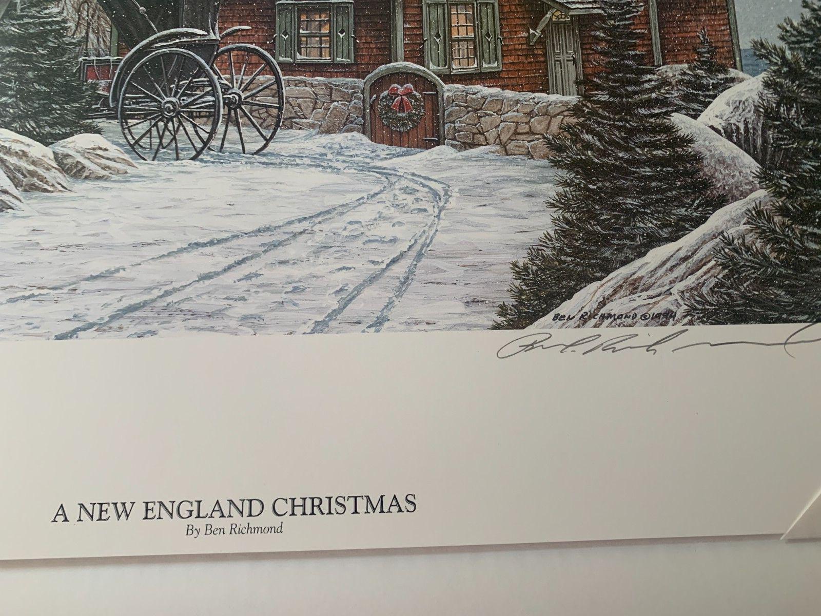 Discover the charm of a snow-covered lakeside cottage with buggy ready for the holidays with "A New England Christmas" by Ben Richmond. This hand-signed lithograph captures the essence of life during the holidays in the country!