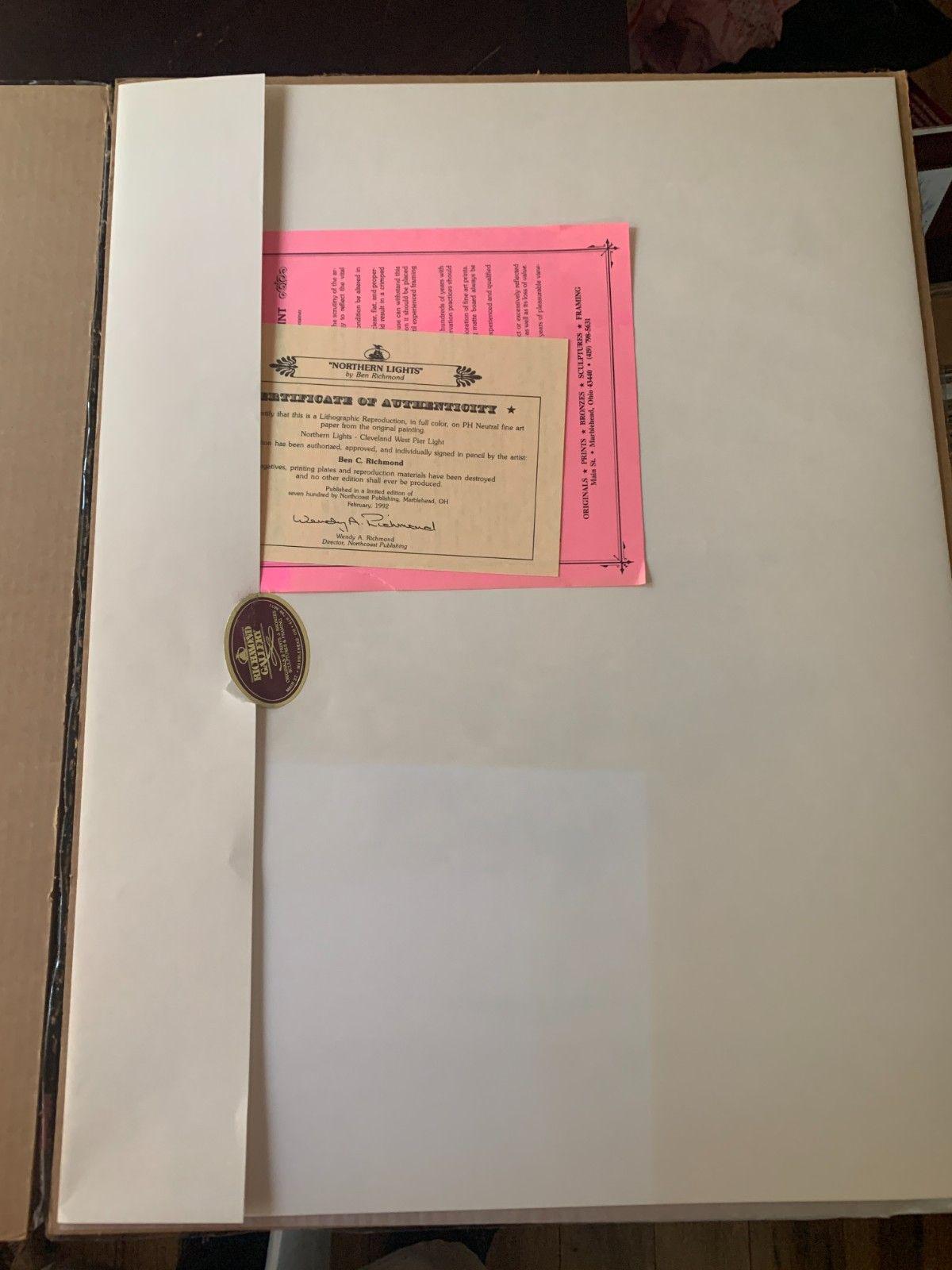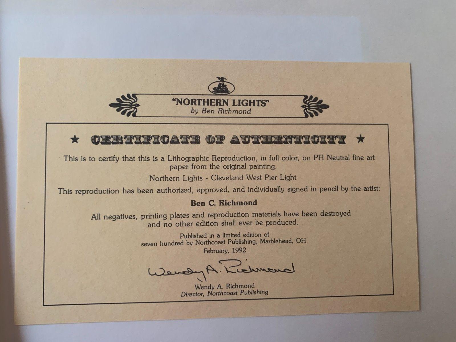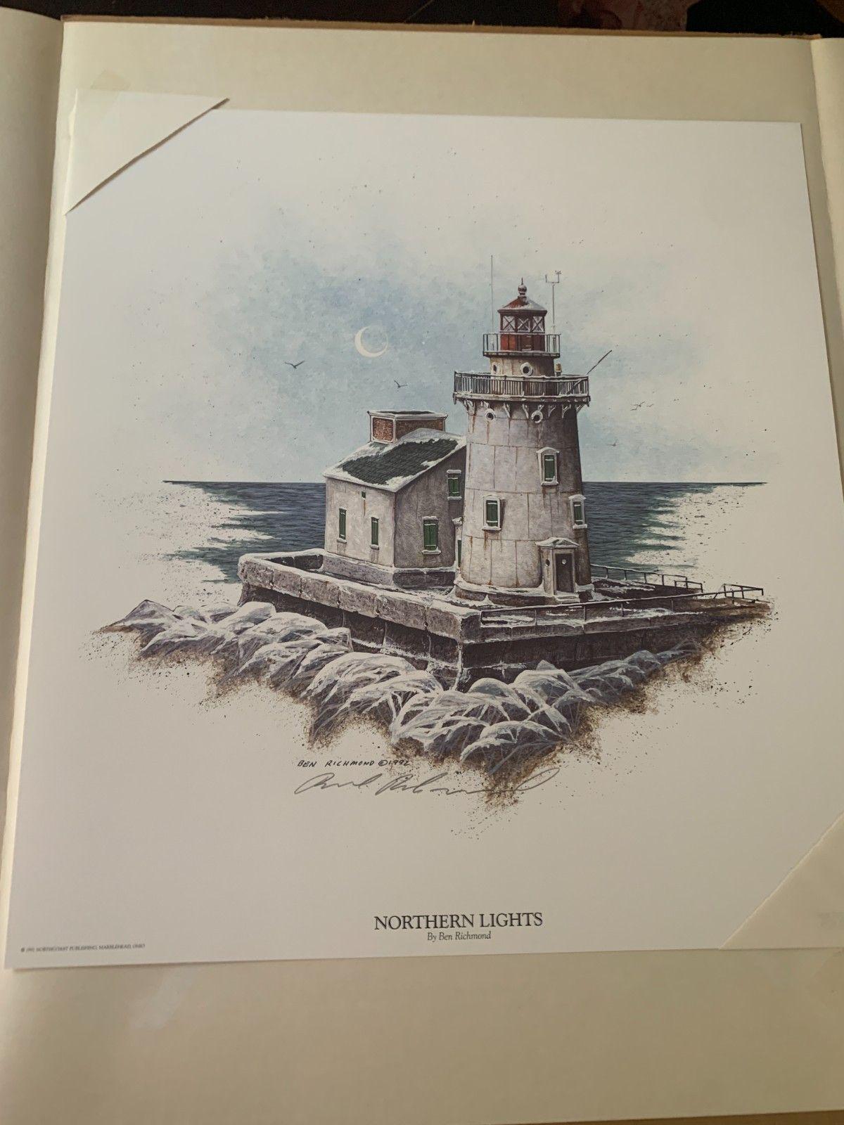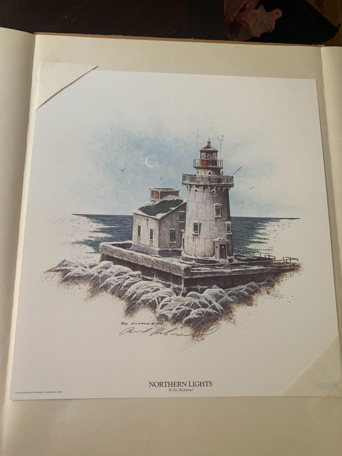 Capturing the rustic lighthouse with "Northern Lights" by Ben Richmond. This hand-signed lithograph captures the Cleveland West Pier Lighthouse on Lake Erie!