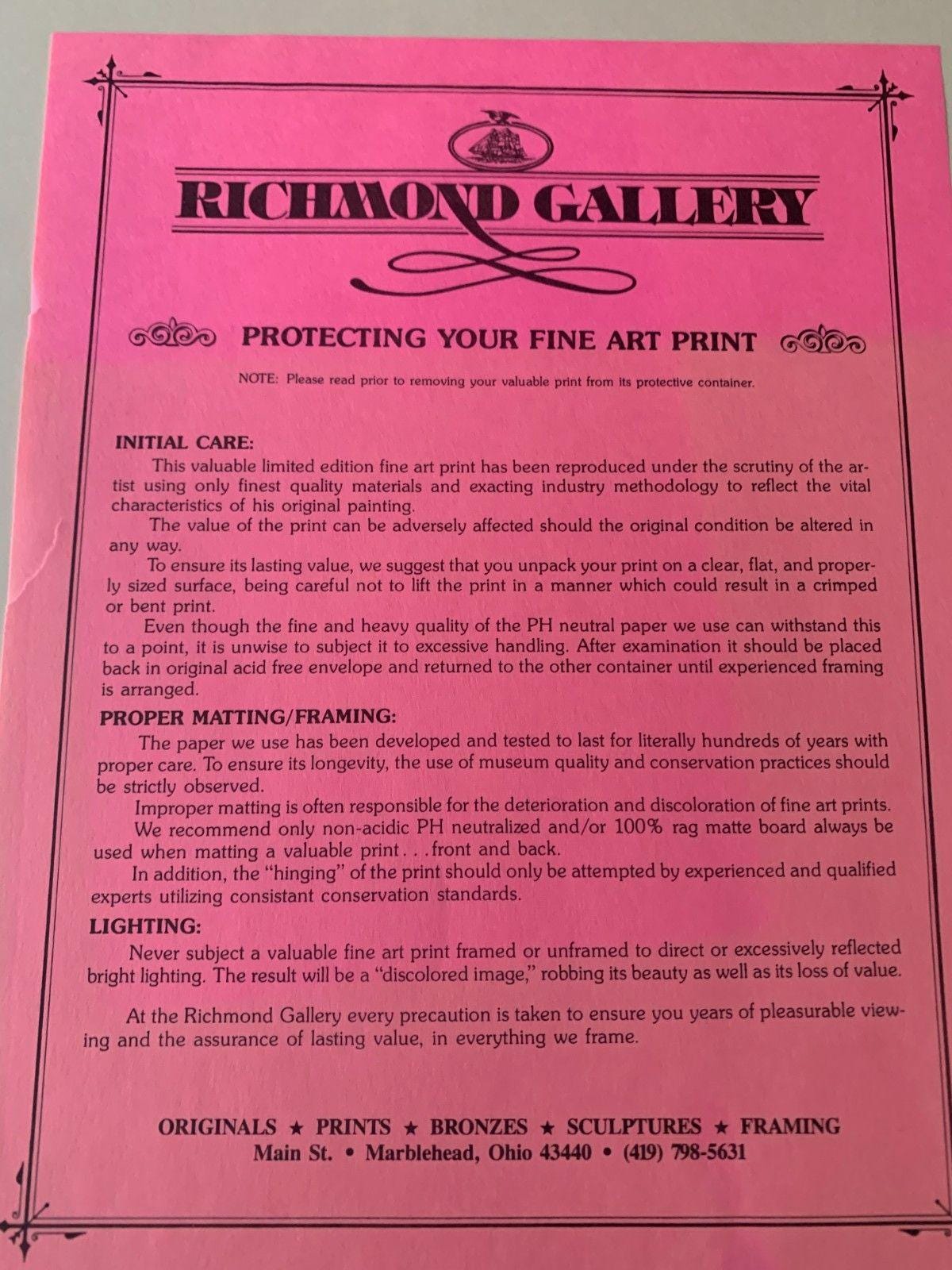 We are currently working with an extensive collection of Ben Richmond Art from a private collection. We have numerous framed and unframed prints that will be listed soon. Contact us if you are looking for a specific print.