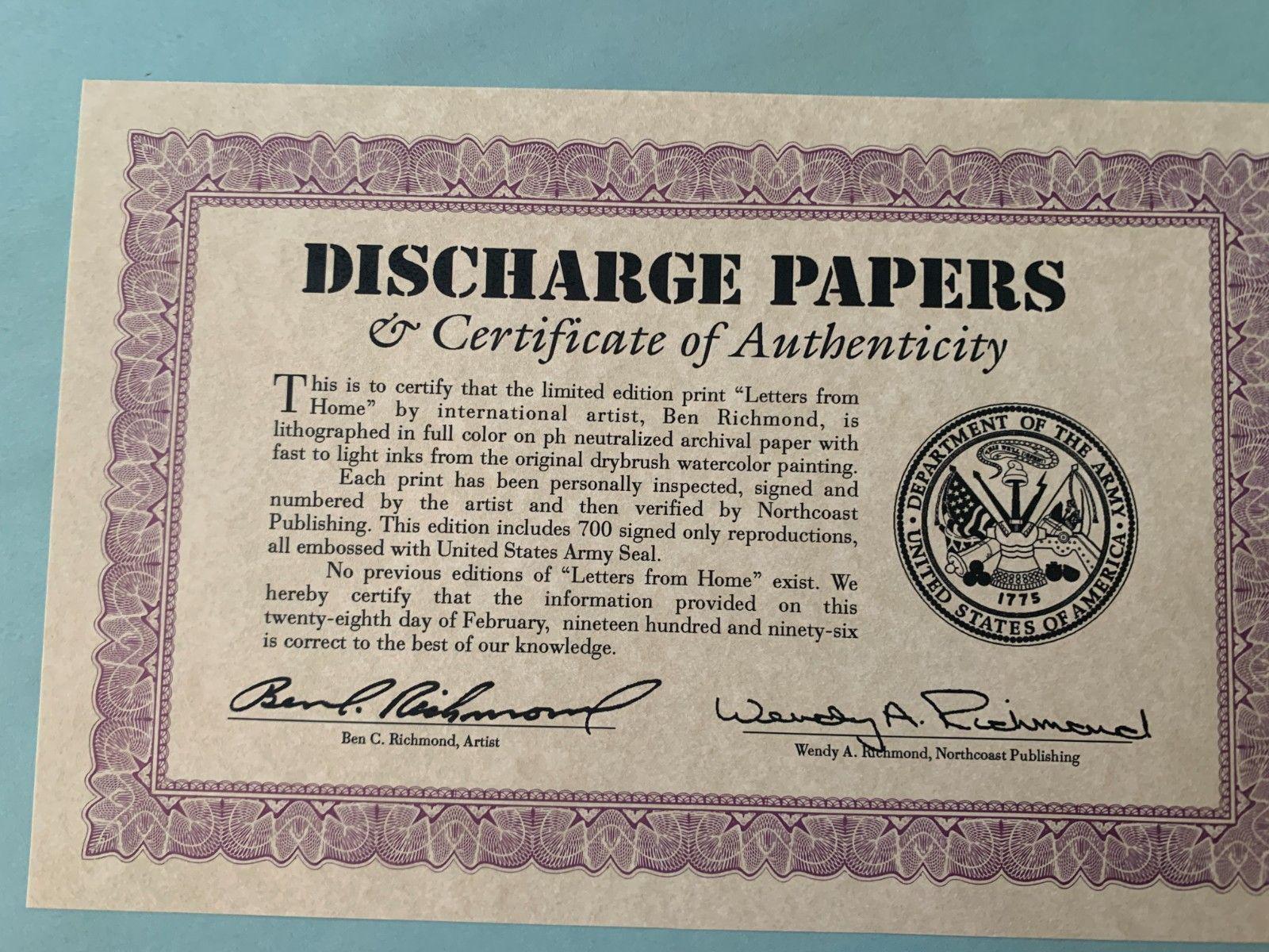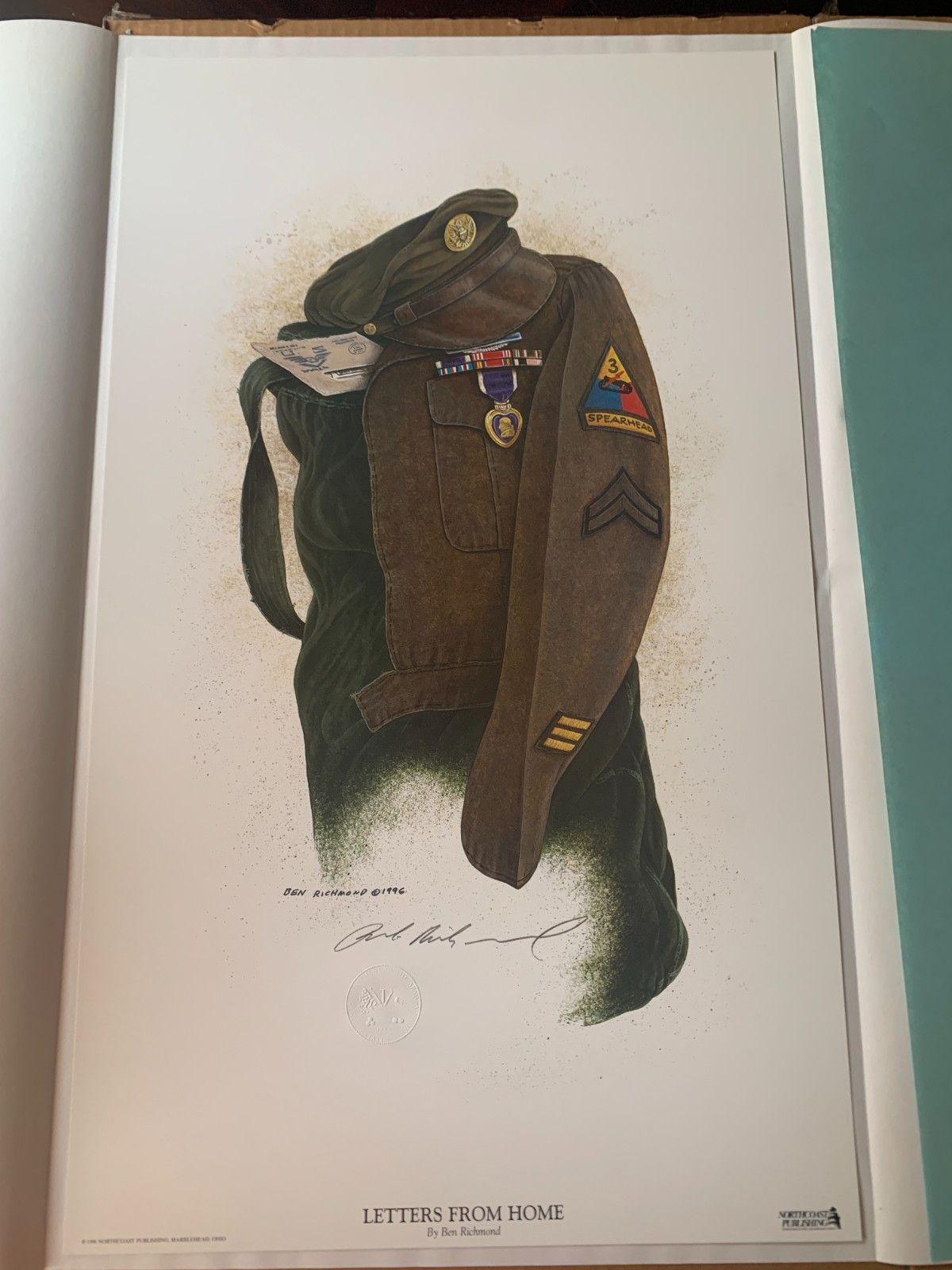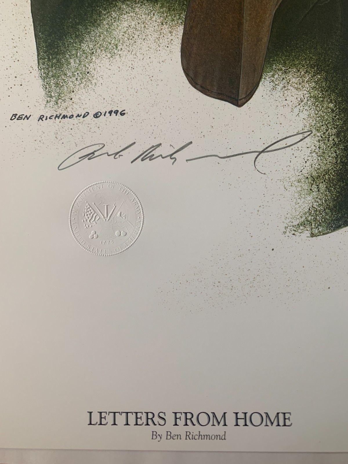 A tribute to the US Army and a soldier who has served with pride and valor with "Letter's From Home" by Ben Richmond. This hand-signed lithograph captures the essence of the life of the protector of the United States! Embossed in the Paper, the United States Army Seal.