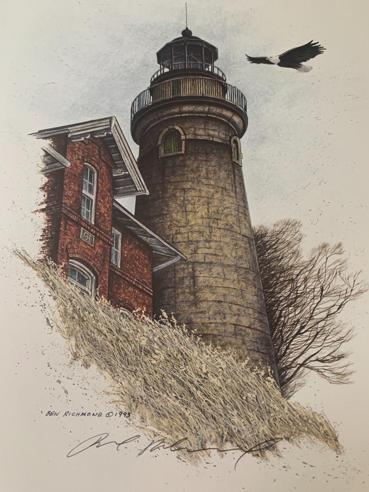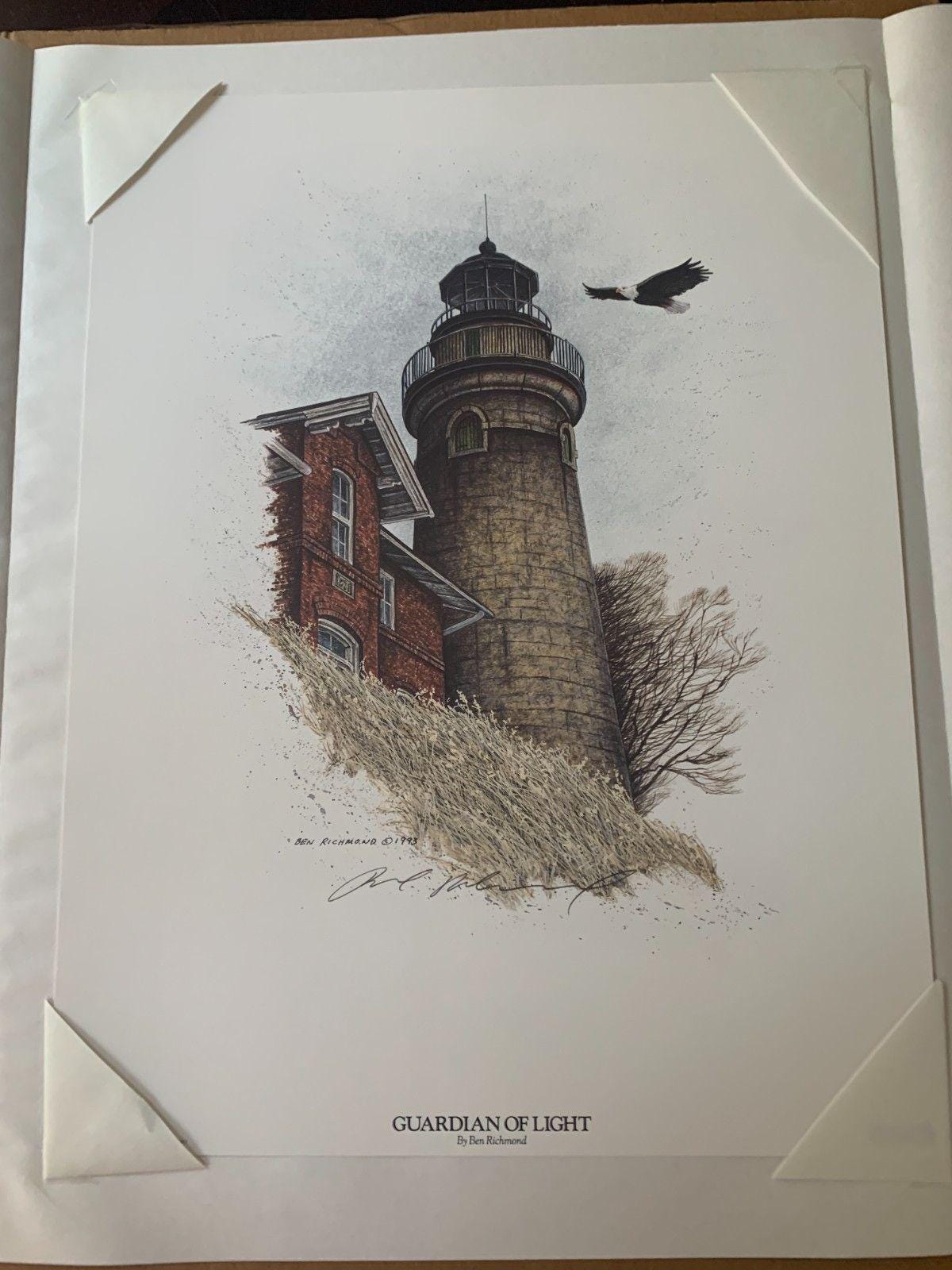 Capturing the rustic lighthouse with an eagle in flight with "Guardian of Light" by Ben Richmond. This hand-signed lithograph captures the Fairport Harbor Lighthouse on Lake Erie!