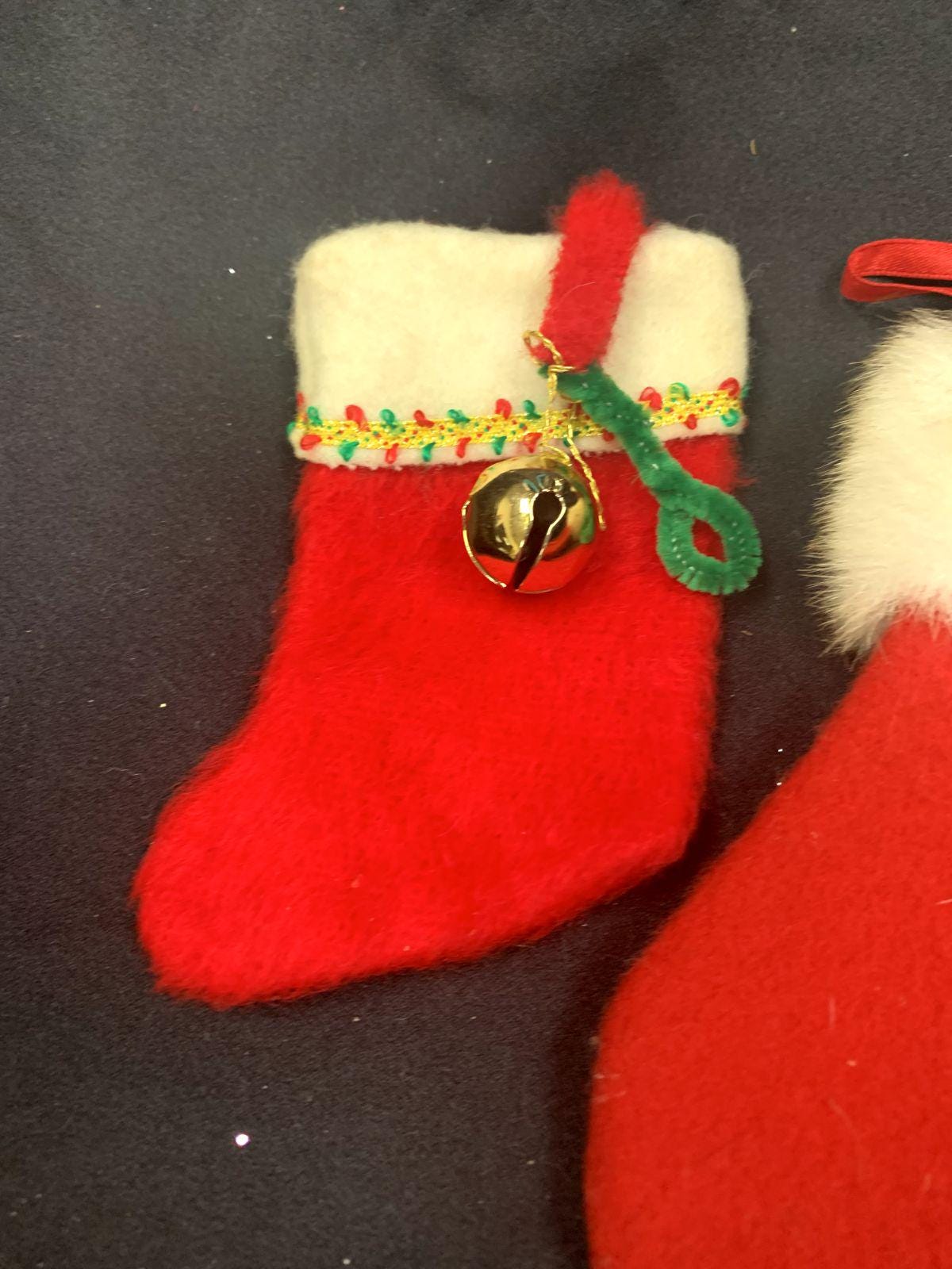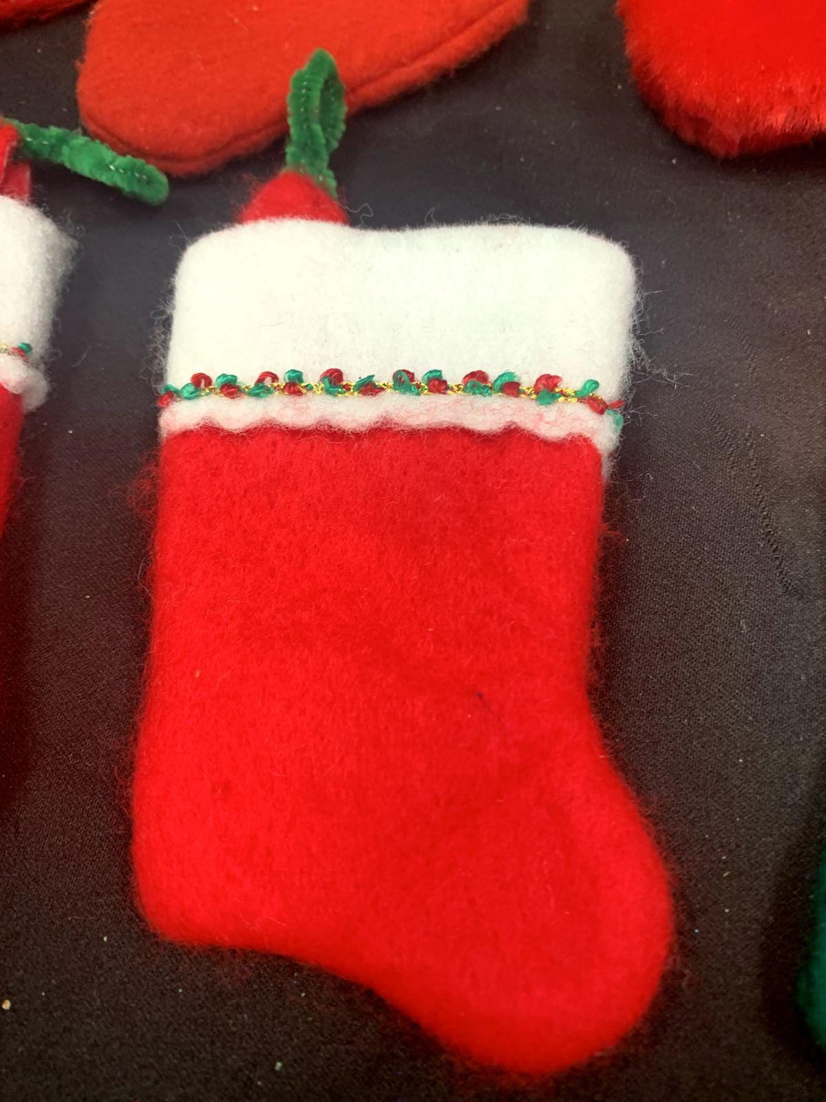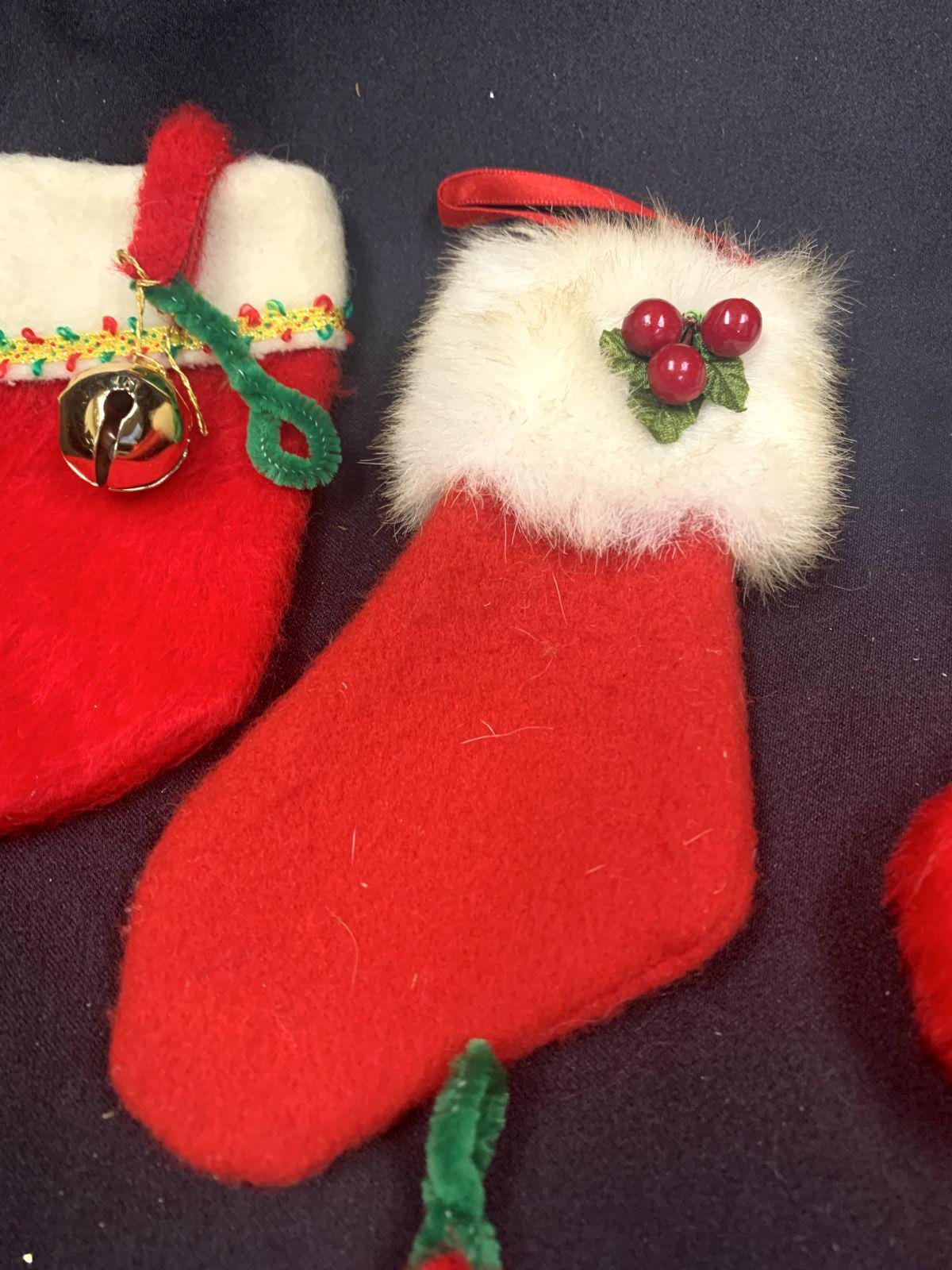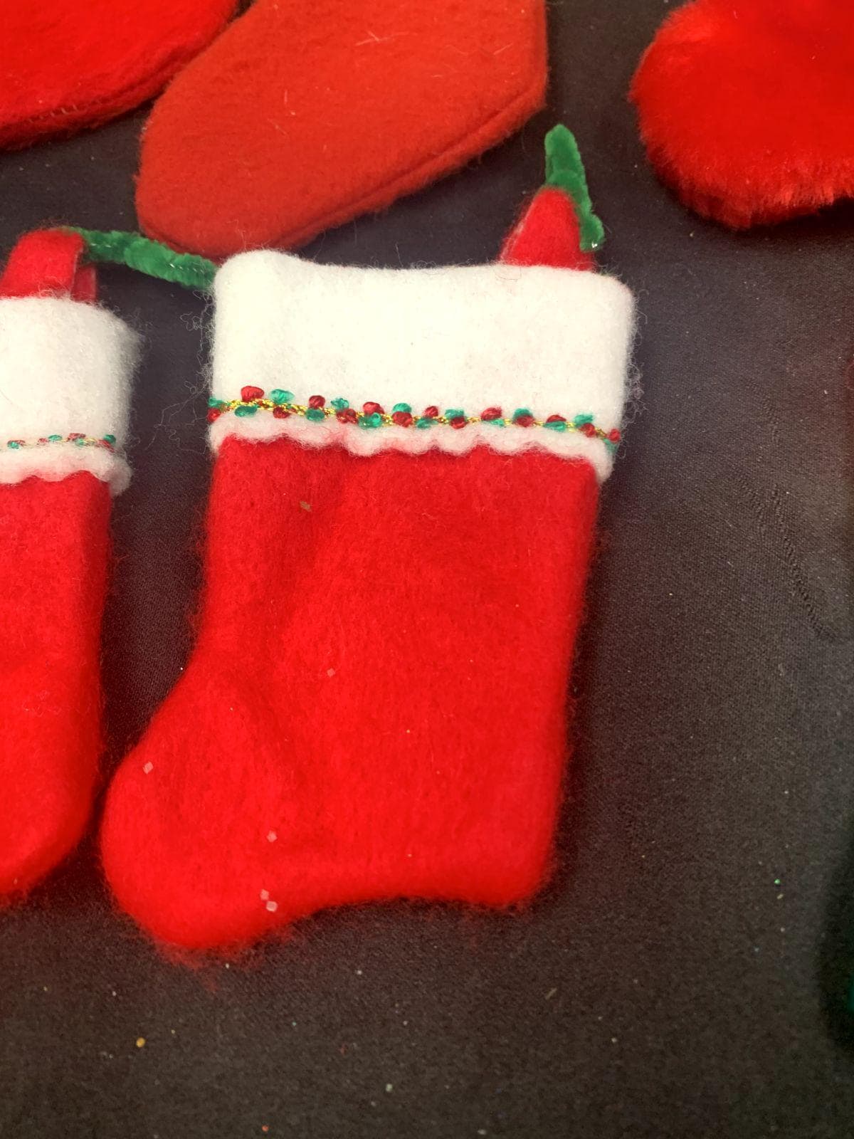 Total of nine stockings - all are miniature-sized - fur or felt - some with accents and can be used as tree ornaments or for decorating!