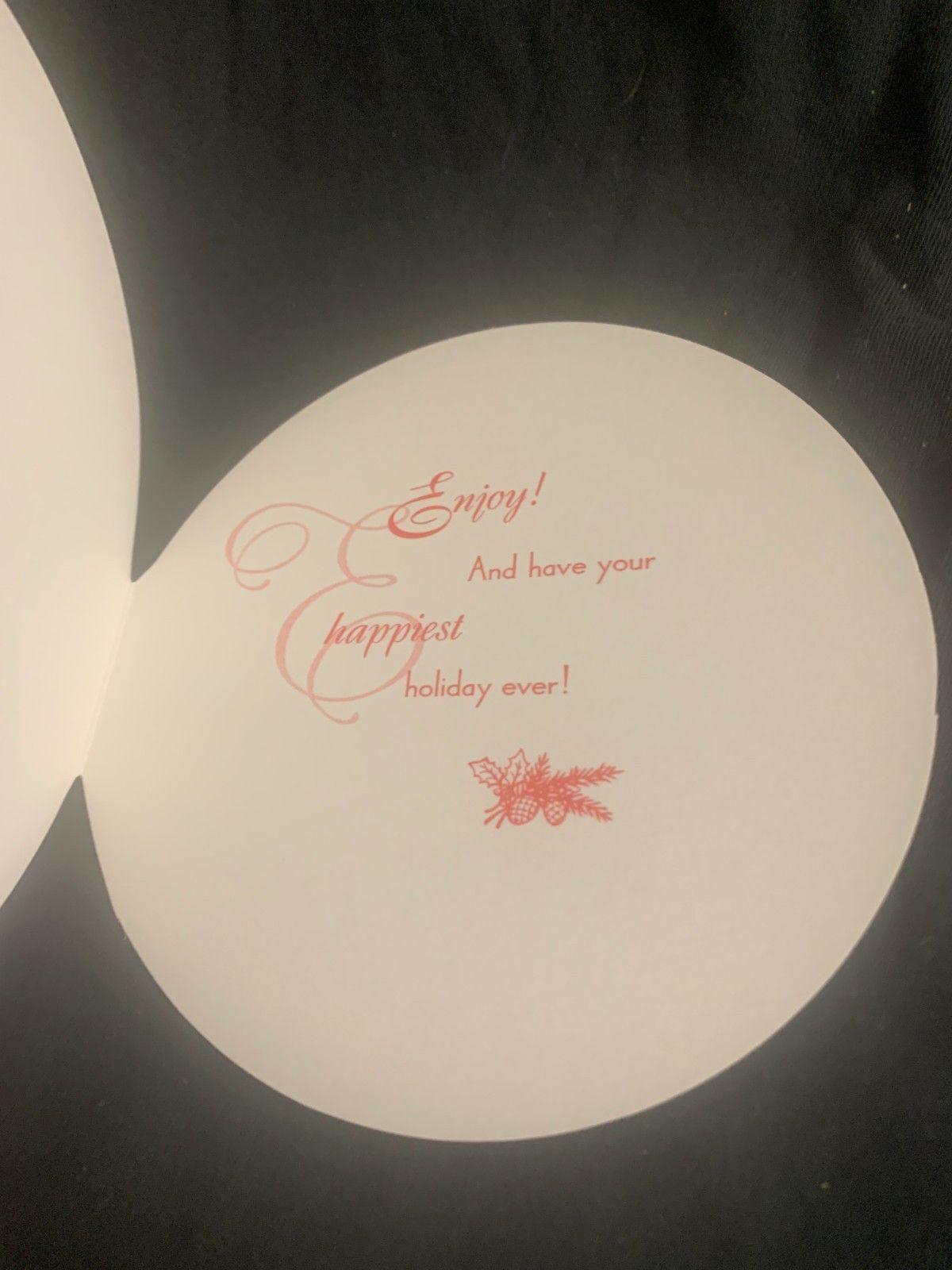 Message inside: "Enjoy! And have your happiest holiday ever!" Made in the USA.