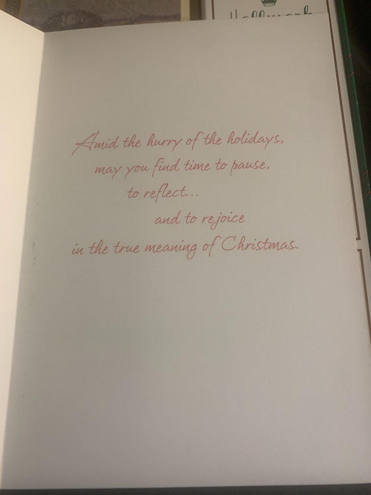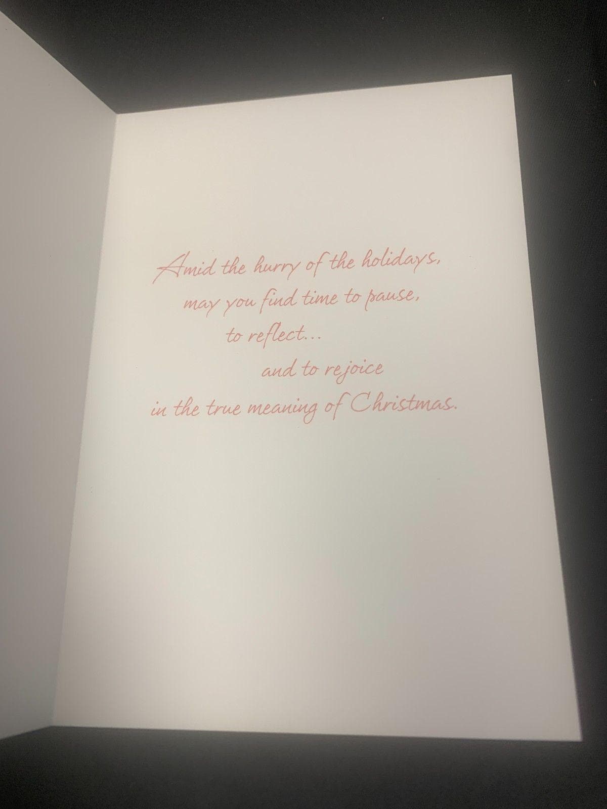 Message inside: "Amid the hurry of the holidays, may you find time to pause, to reflect... and to rejoice in the true meaning of Christmas." Made in the USA.