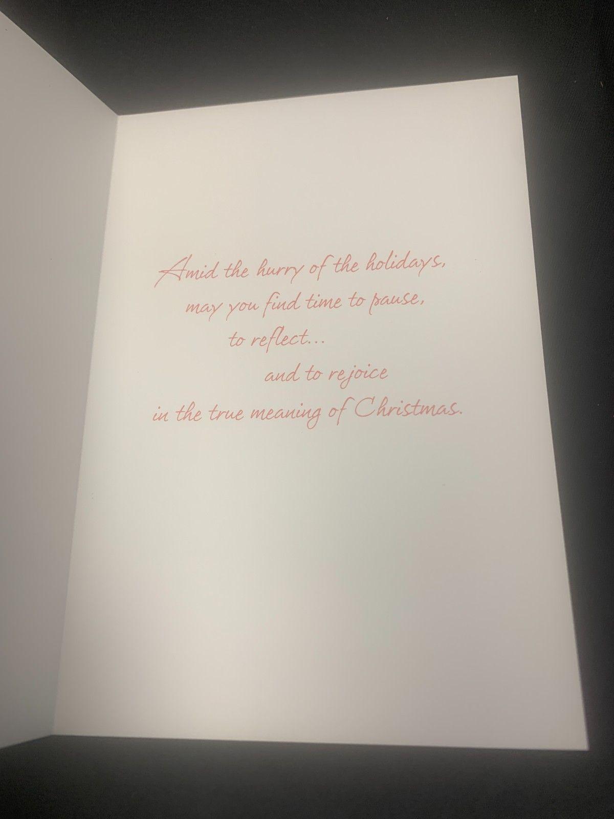 Message inside: "Amid the hurry of the holidays, may you find time to pause, to reflect... and to rejoice in the true meaning of Christmas." Made in the USA.