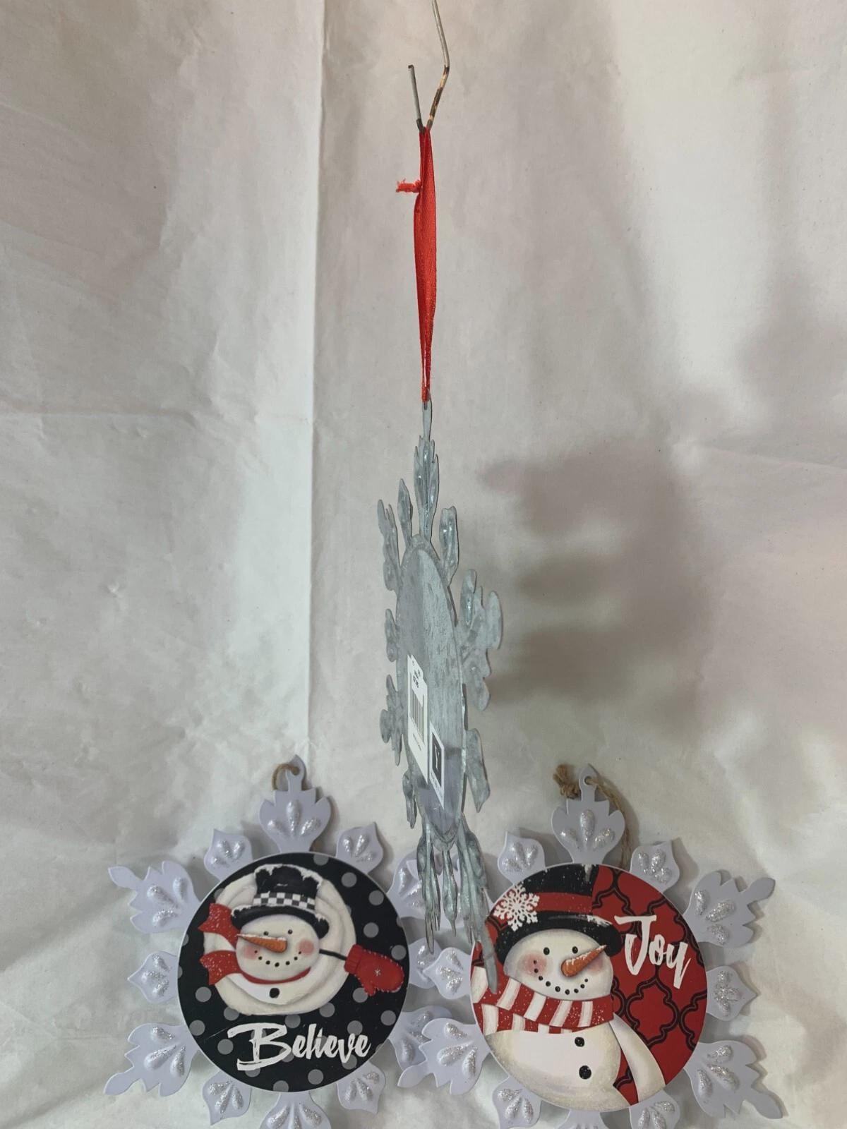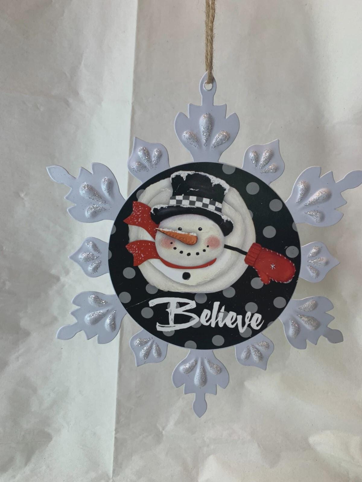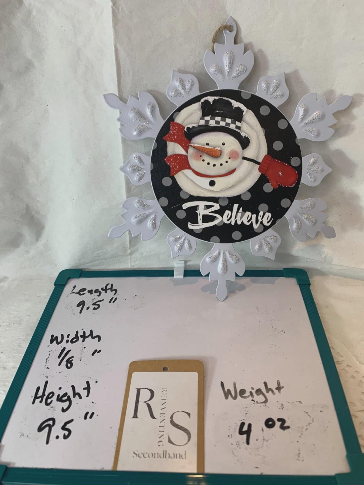 ~White metal snowflake with snowman image and the word "Believe." (one available)