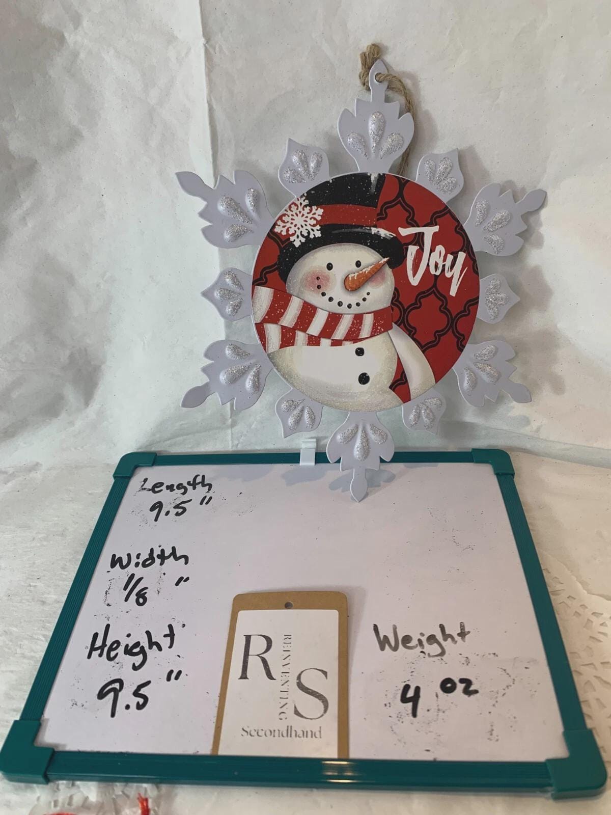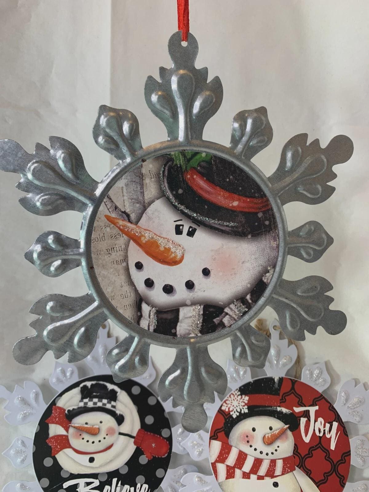 ~White metal snowflake with snowman image and the word "Joy." (one available)