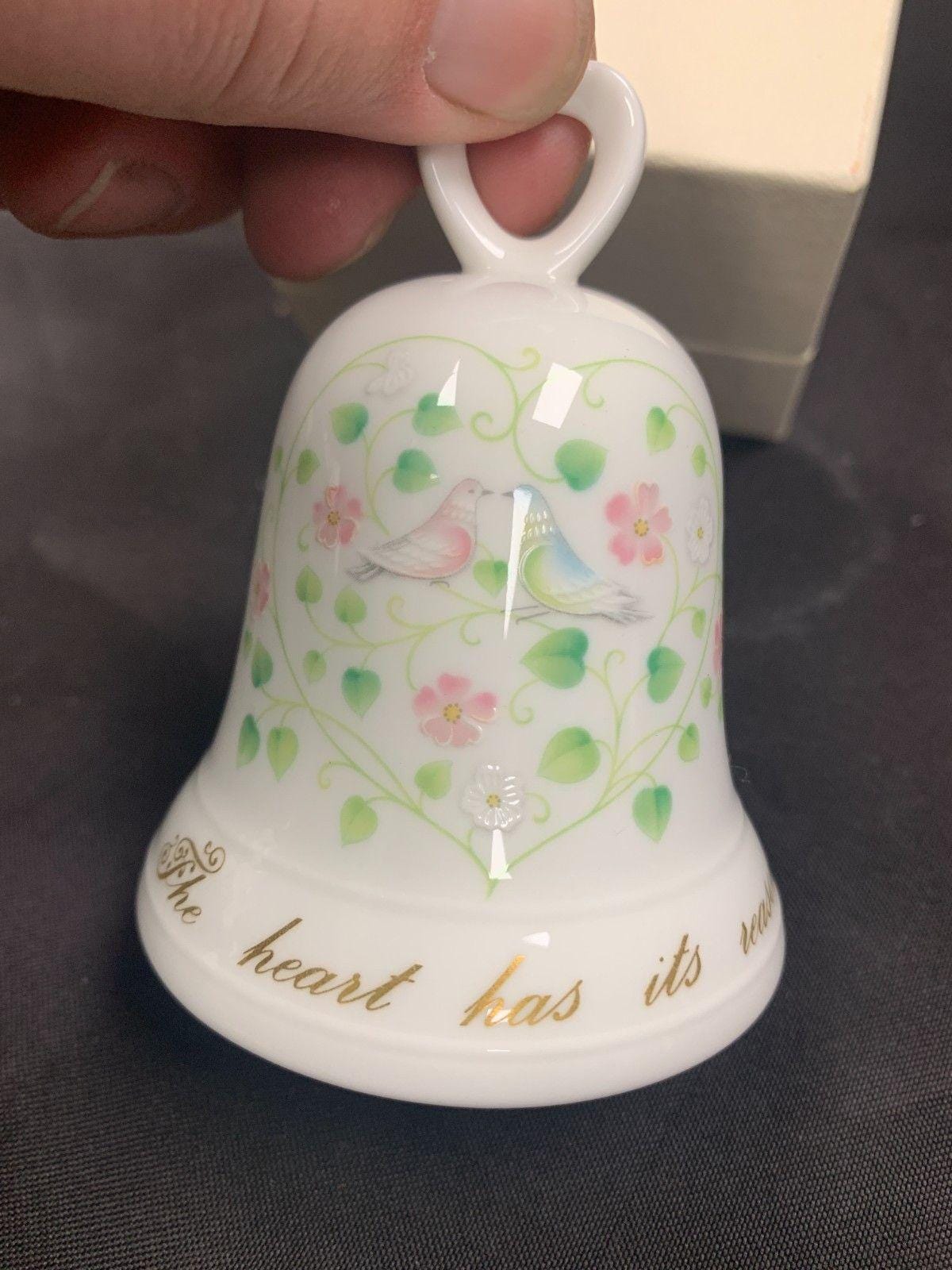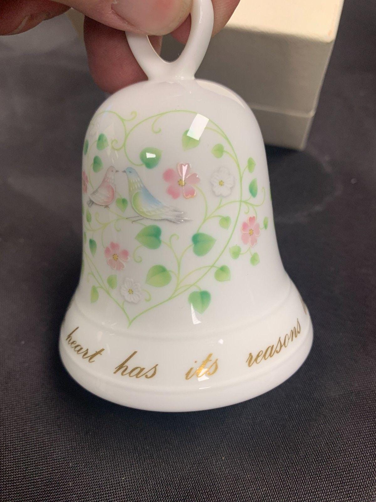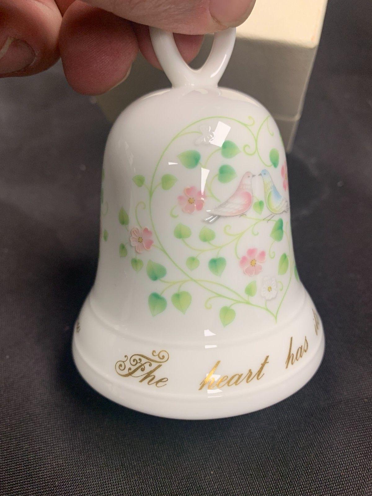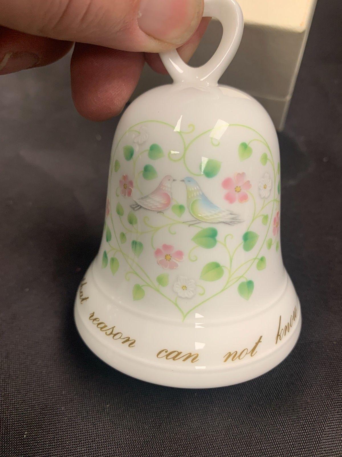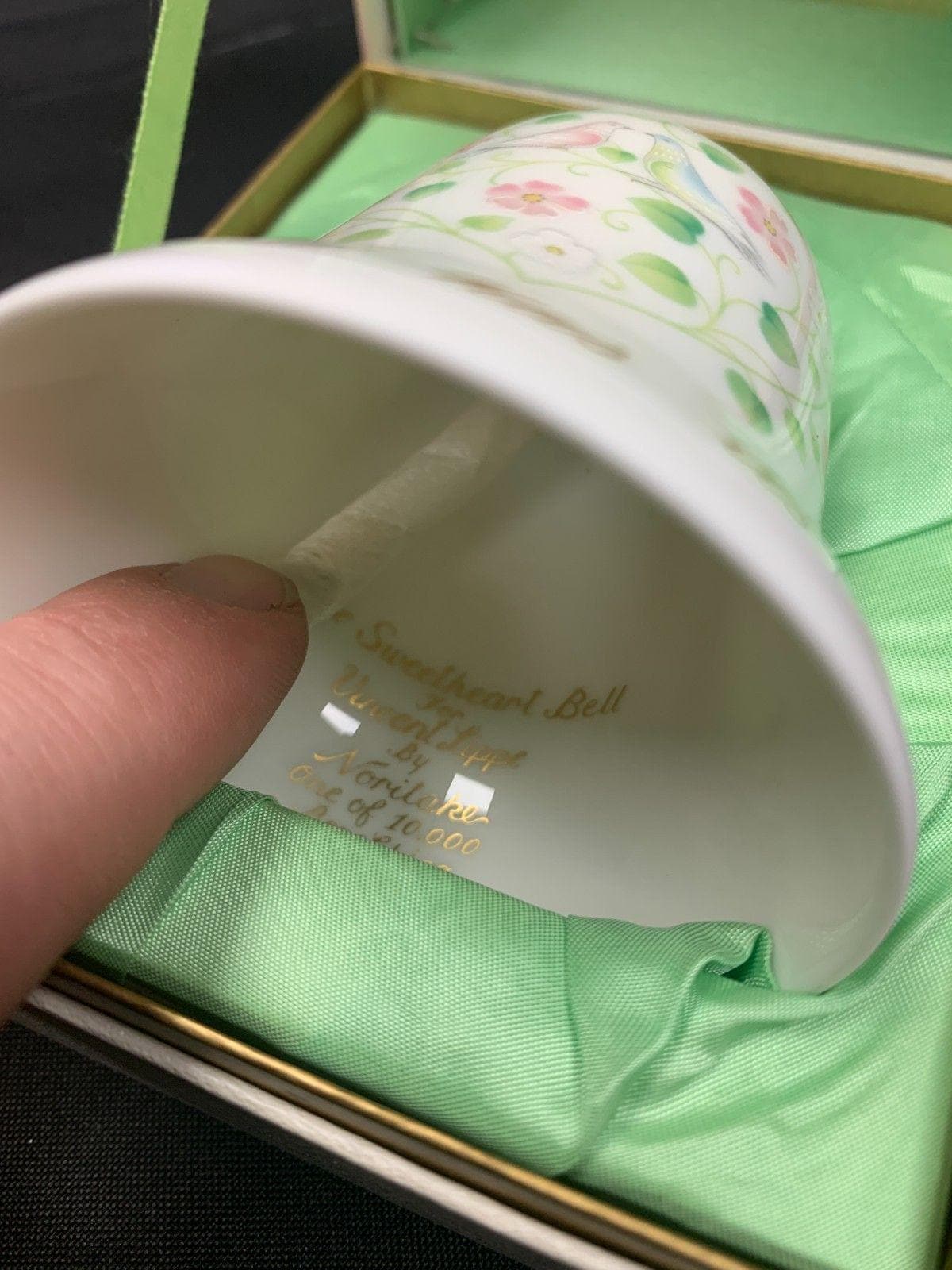 This decorative bell features a pristine style with a glossy finish, showcasing a beautiful floral pattern of white and gold petals and two sweet birds. Signed by Vincent Lippe, this limited edition piece is part of a collection of 10,000. It comes in its original box, making it a cherished addition to any home decor display or gift for that special "sweetheart" in your life!