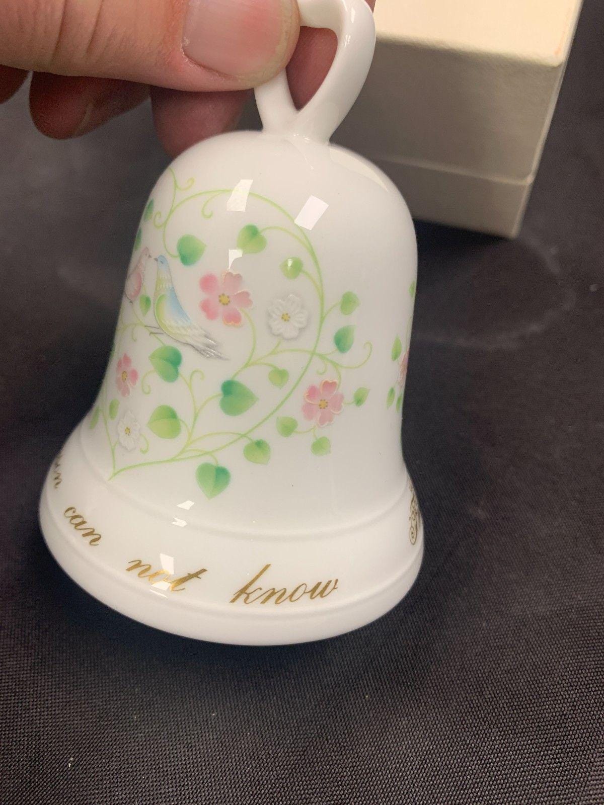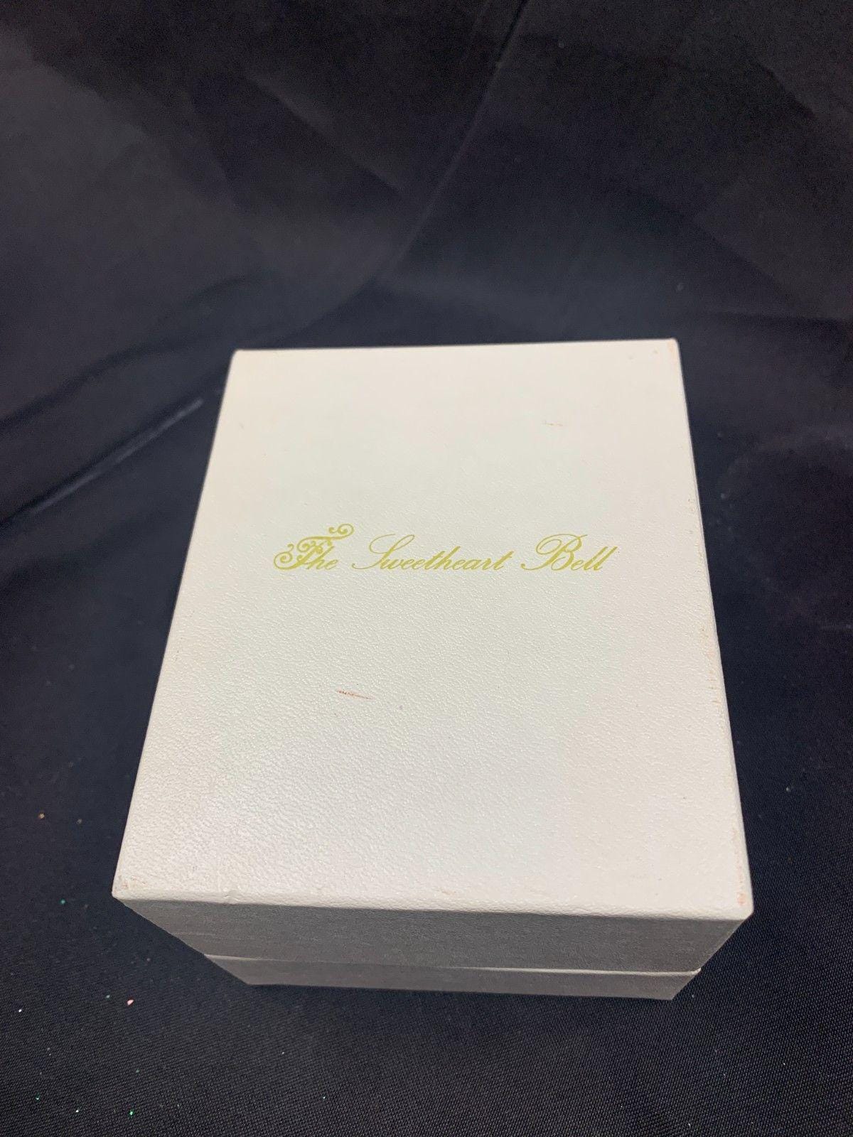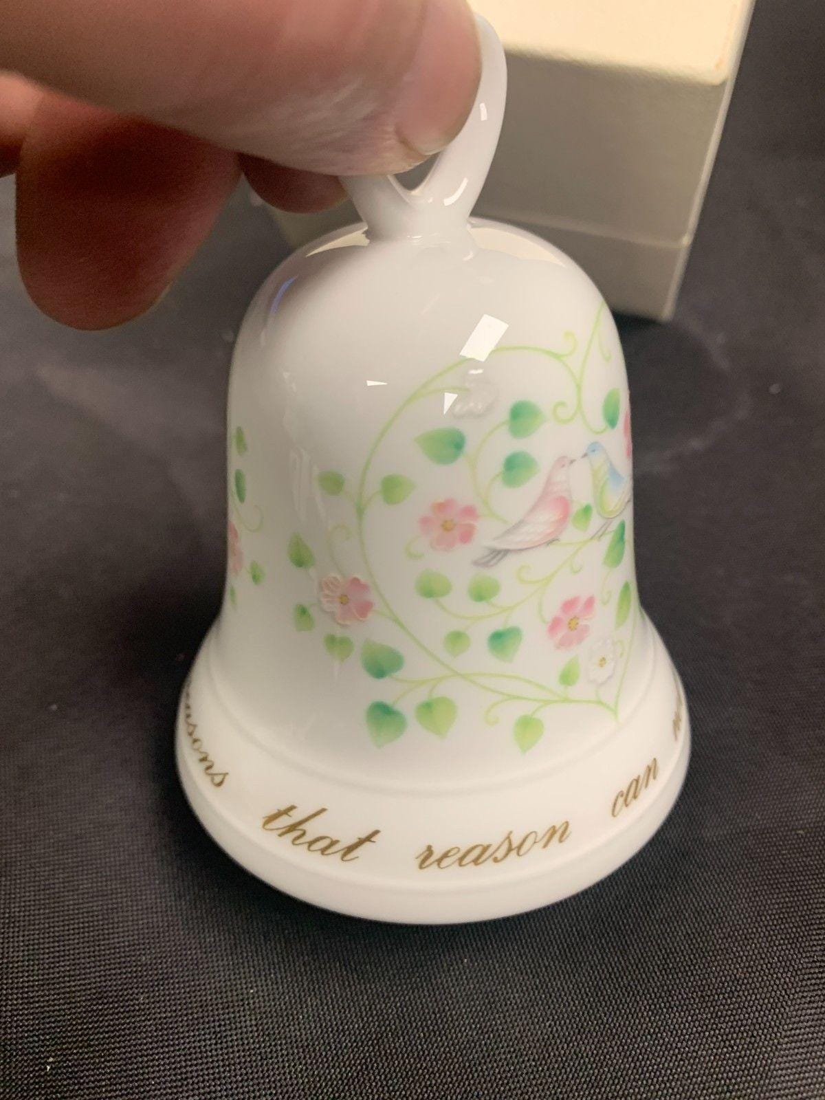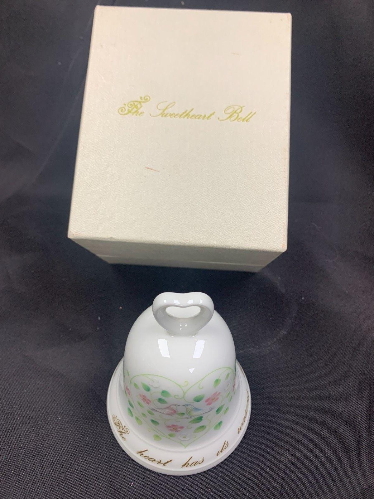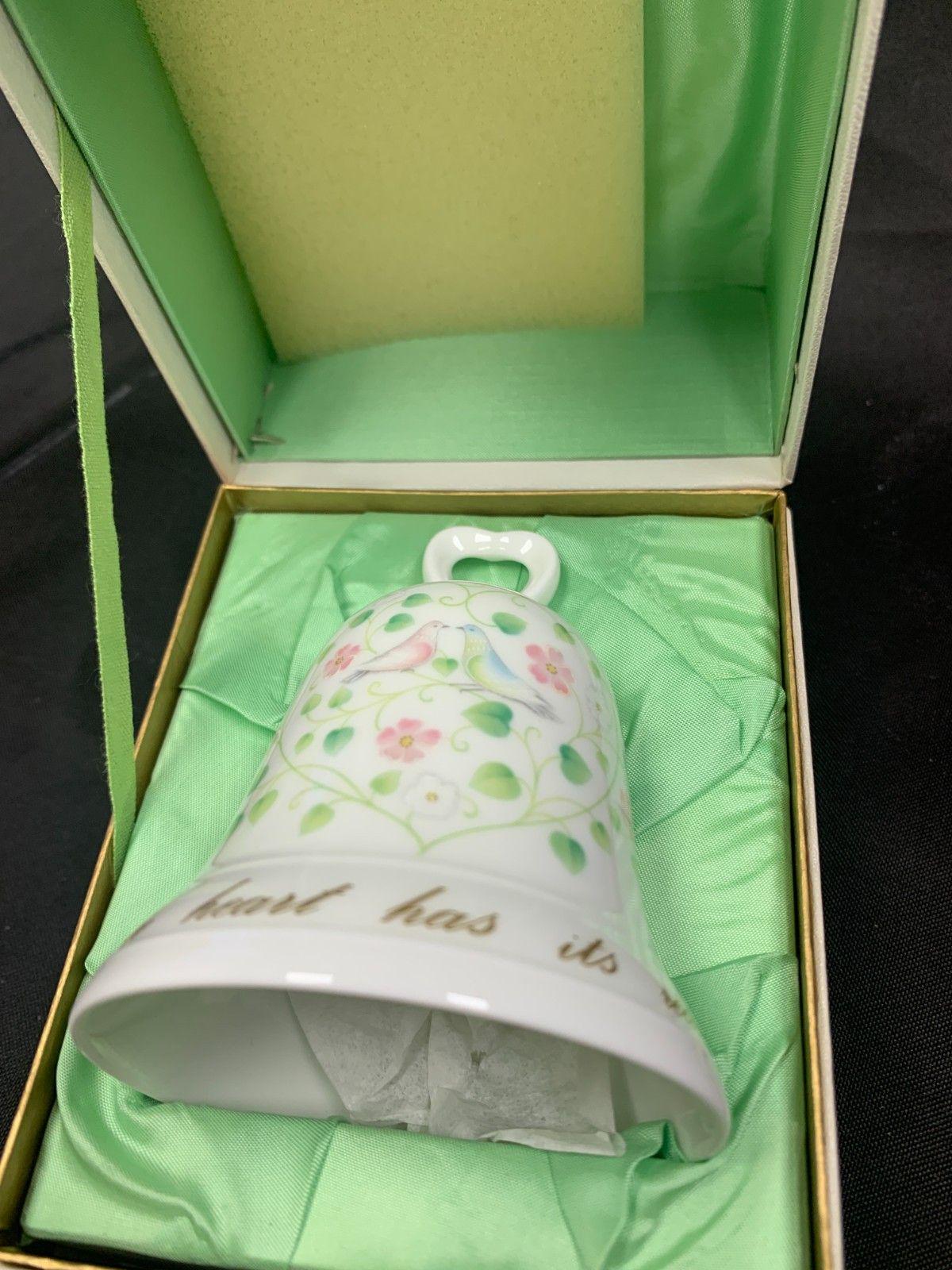 This decorative bell features a pristine style with a glossy finish, showcasing a beautiful floral pattern of white and gold petals and two sweet birds. Signed by Vincent Lippe, this limited edition piece is part of a collection of 10,000. It comes in its original box, making it a cherished addition to any home decor display or gift for that special "sweetheart" in your life!