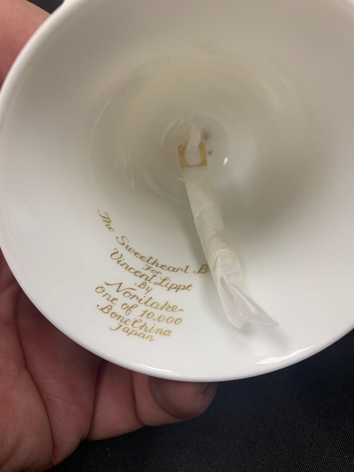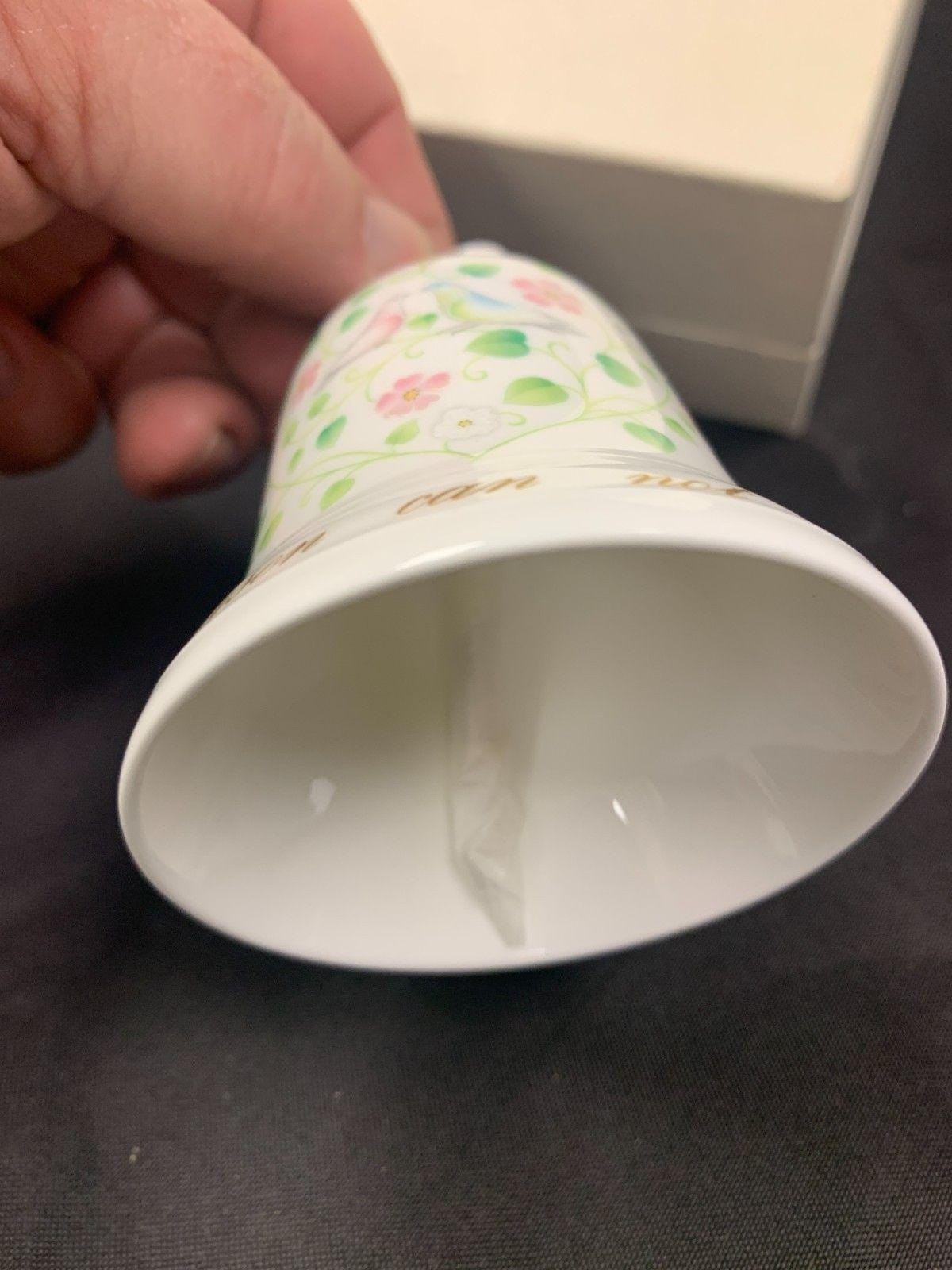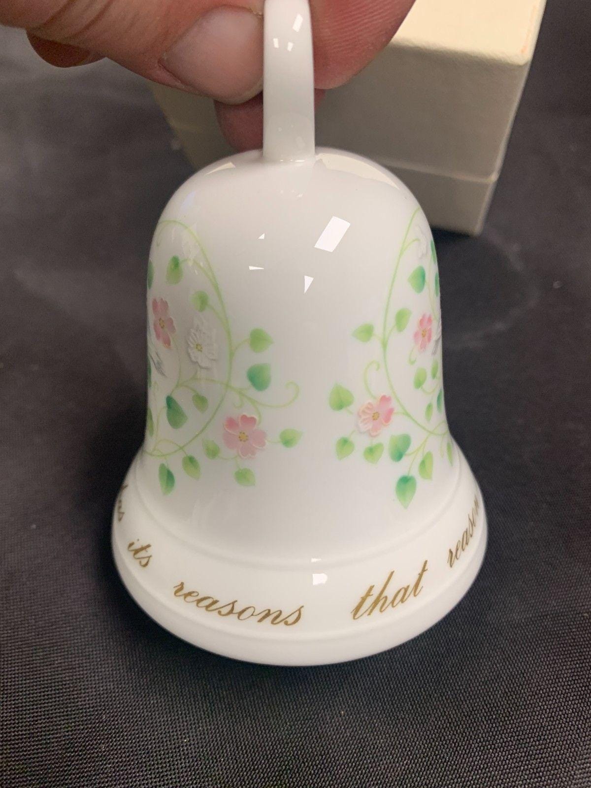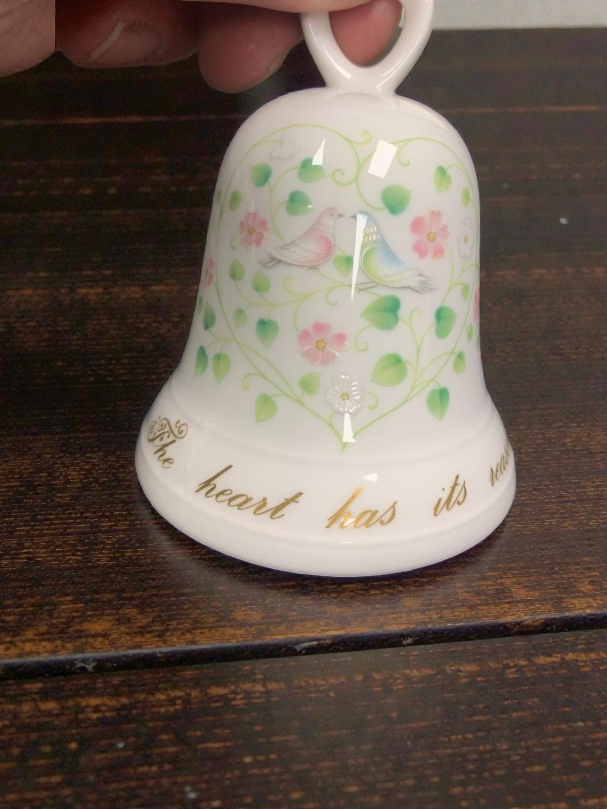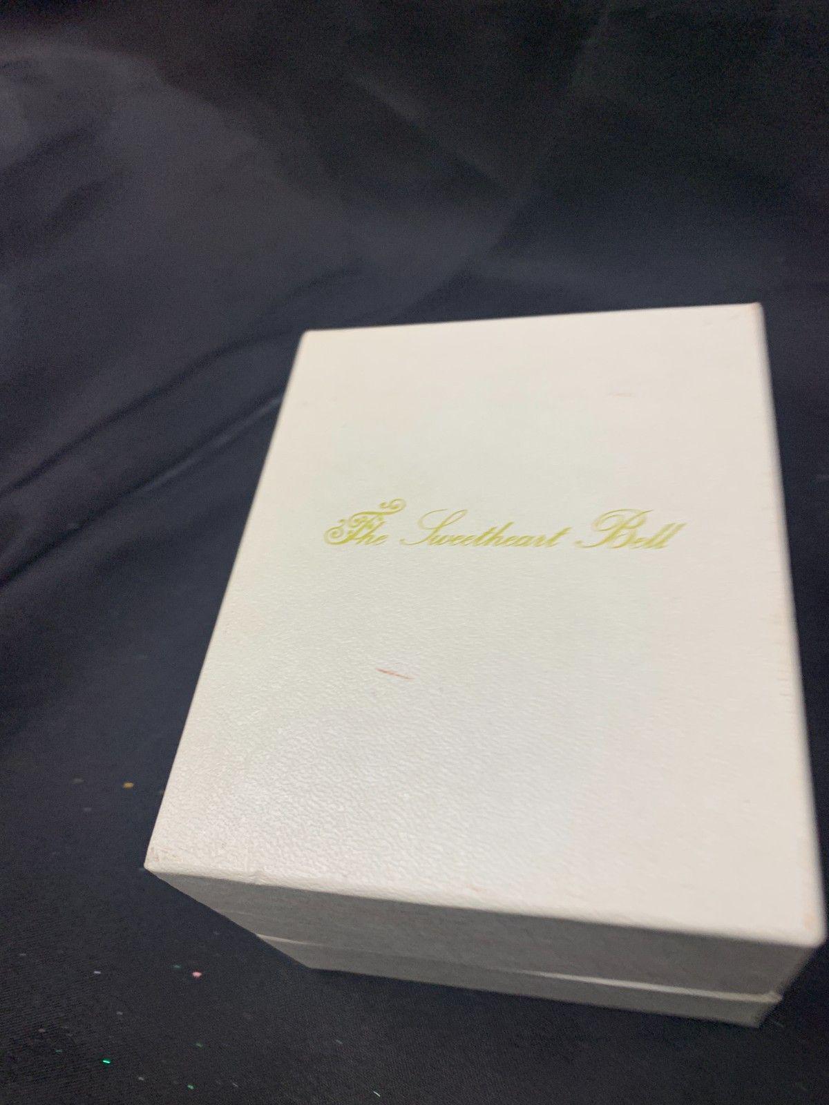 This decorative bell features a pristine style with a glossy finish, showcasing a beautiful floral pattern of white and gold petals and two sweet birds. Signed by Vincent Lippe, this limited edition piece is part of a collection of 10,000. It comes in its original box, making it a cherished addition to any home decor display or gift for that special "sweetheart" in your life!