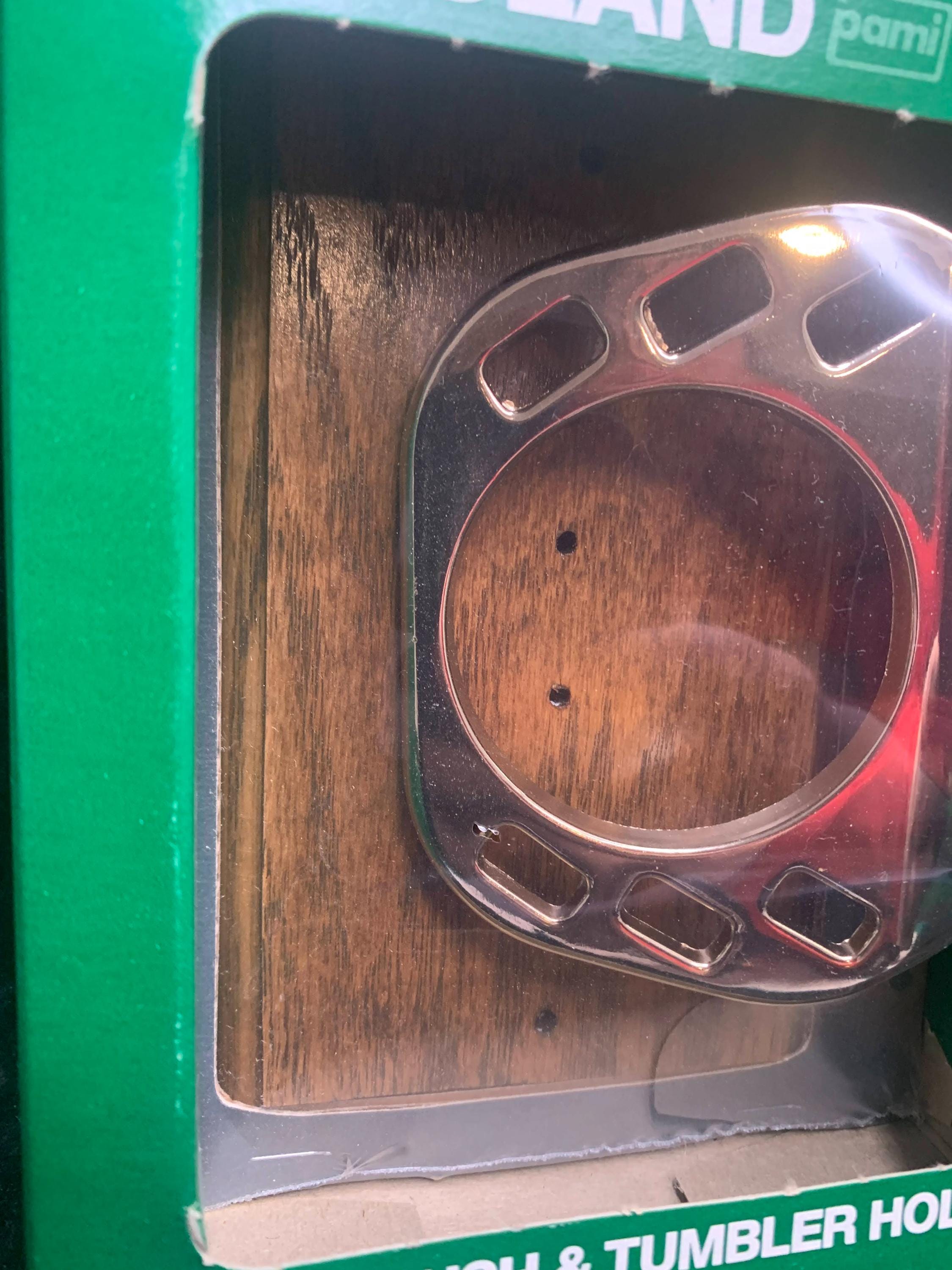 This collectible product features a chrome-plated holder attached to a solid wood backing!
